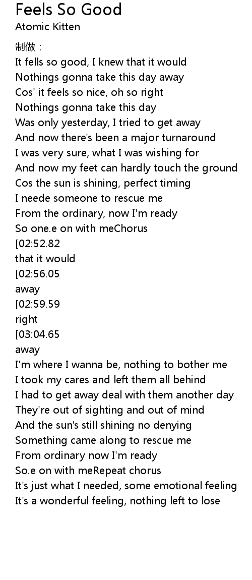 | [03:07.64][02:52.82][02:36.51][01:50.89][01:00.47] | Cos It feels so good I knew that it would |