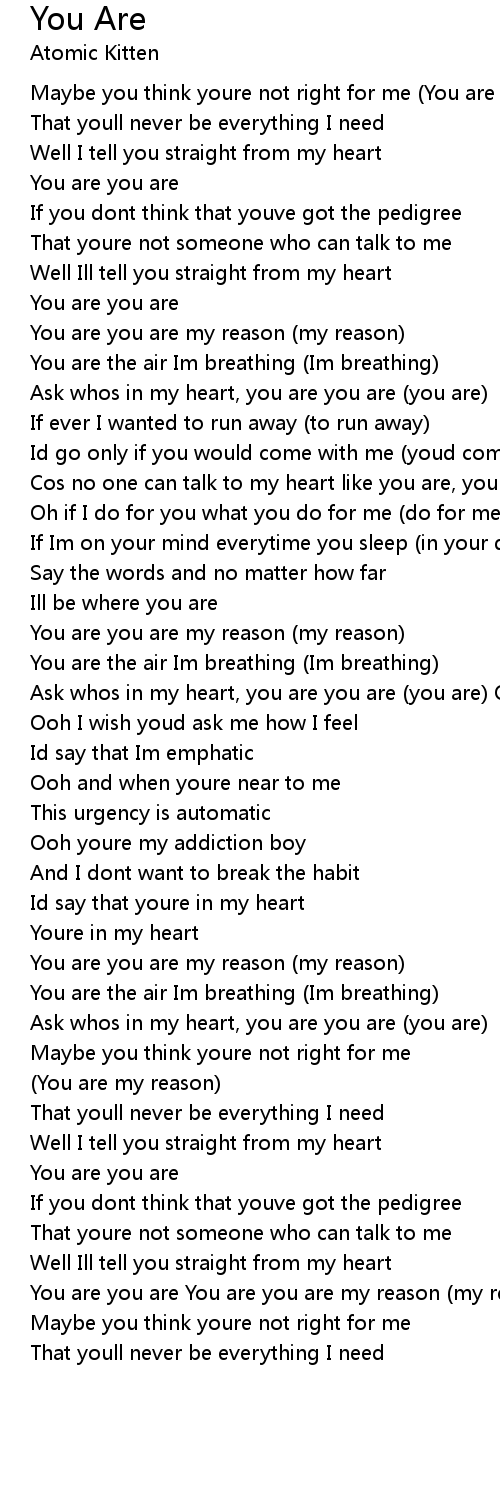 | [03:13.380] | You are you are You are you are my reason (my reason) You are the air Im breathing (Im breathing) Ask whos in my heart, you are you are (you are) |