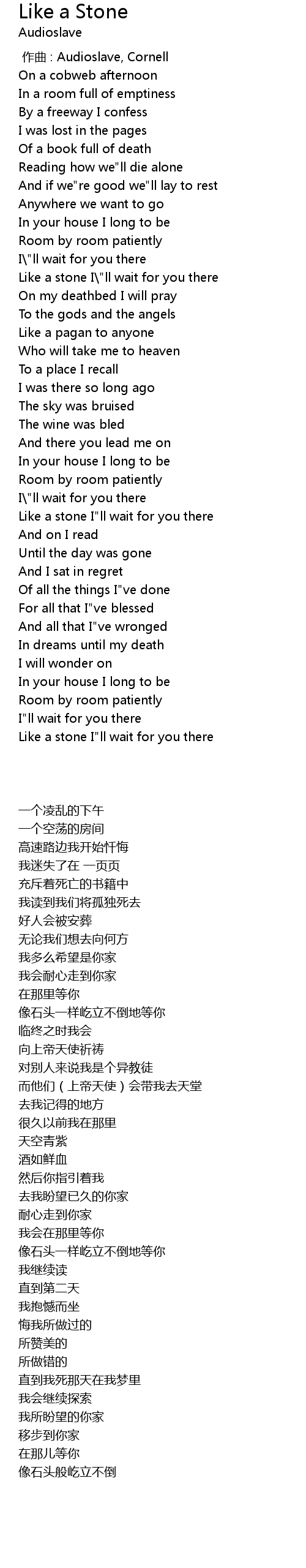 | [04:25.800] | Like a stone I" ll wait for you there |