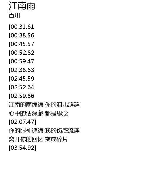 | [03:06.80][02:38.63][00:59.83] | 江南的雨啊 连绵不断 |