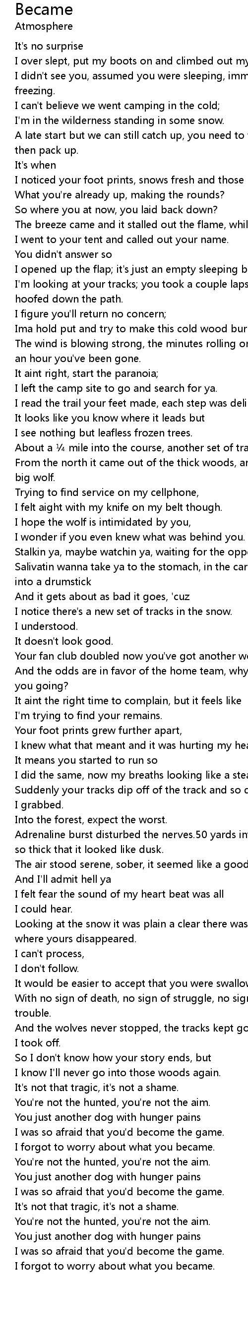 | And the wolves never stopped, the tracks kept going and | |