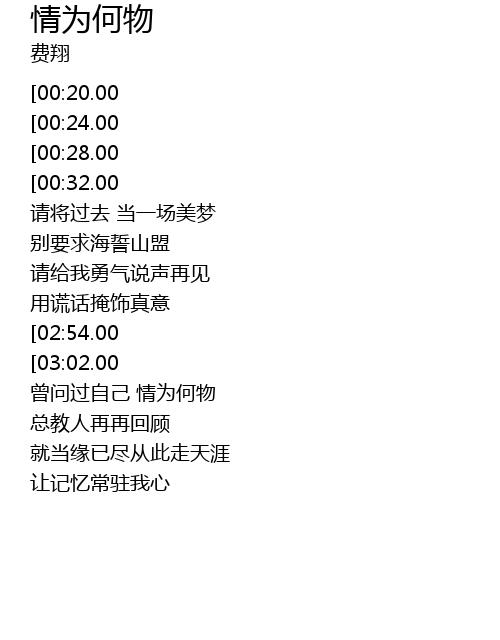 | [03:10.00][02:54.00][02:38.00][02:03.00][01:47.00][00:54.00] | 呀…情为何物 |
