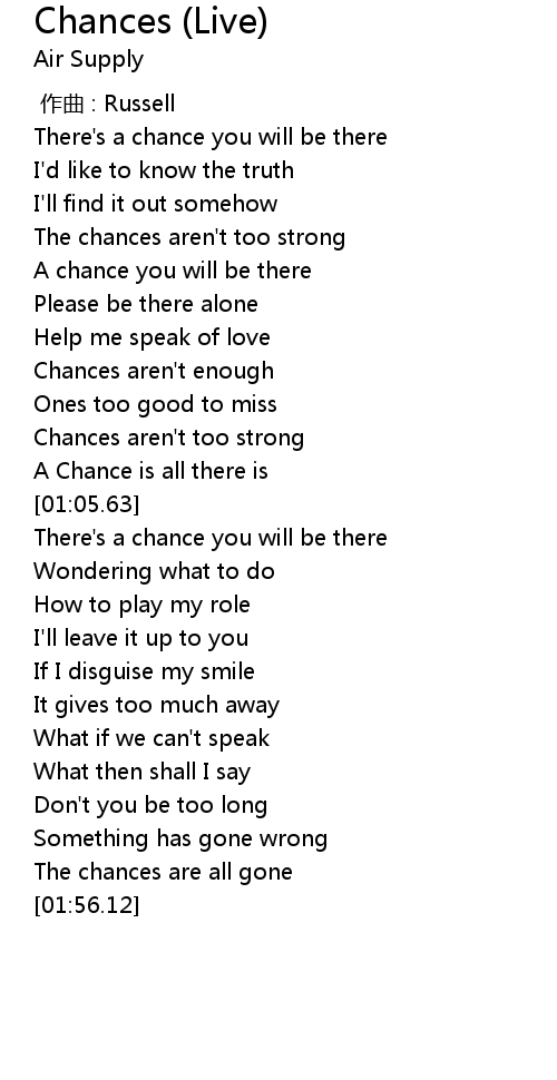 | [00:57.39] | Chances aren' t too strong |