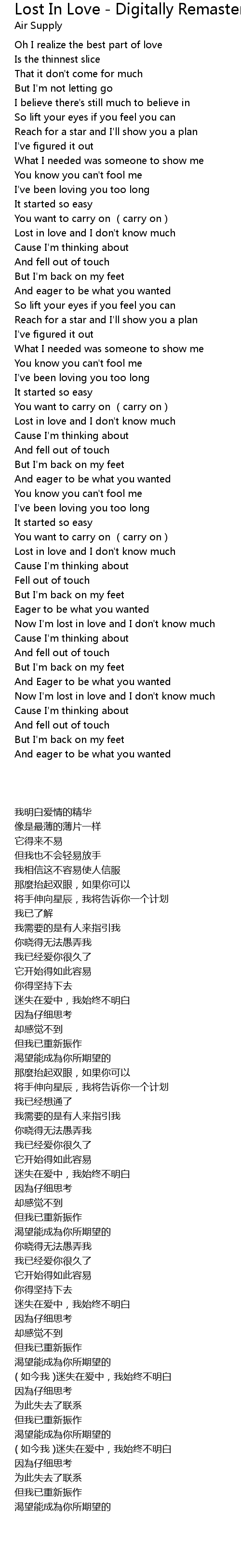 | [03:14.990] | Now I'm lost in love and I don't know much |