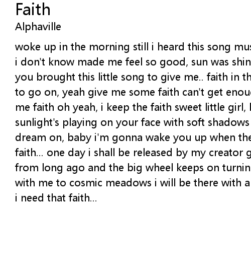 woke up in the morning still i heard this song must be somewhere from my dreams, i don't know made me feel so good, sun was shining bright god, i love you that you brought this little song to give me.. faith in the morning i need that faith to go on, yeah give me some faith can't get enough of that sweet feeling, give me faith oh yeah, i keep the faith sweet little girl, lying next to me sunlight's playing on your face with soft shadows you're so beautiful, dream on, dream on, baby i'm gonna wake you up when the time is right i'll give you.. faith... one day i shall be released by my creator going home to where i came from long ago and the big wheel keeps on turning round and round into eternity with me to cosmic meadows i will be there with all my friends.. ..in the morning i need that faith... |