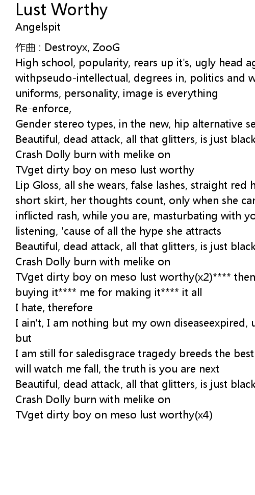 | Lip Gloss, all she wears, false lashes, straight red hairshort skirt, a very short skirt, her thoughts count, only when she can't fight backpervert, self inflicted rash, while you are, masturbating with your tongueyou are, only listening, 'cause of all the hype she attracts | |