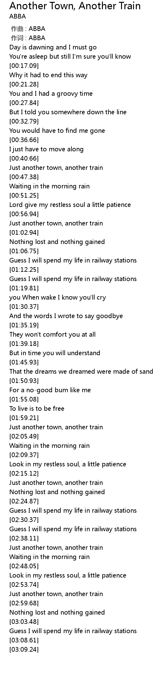 | [00:43.59] | Just another town, another train |