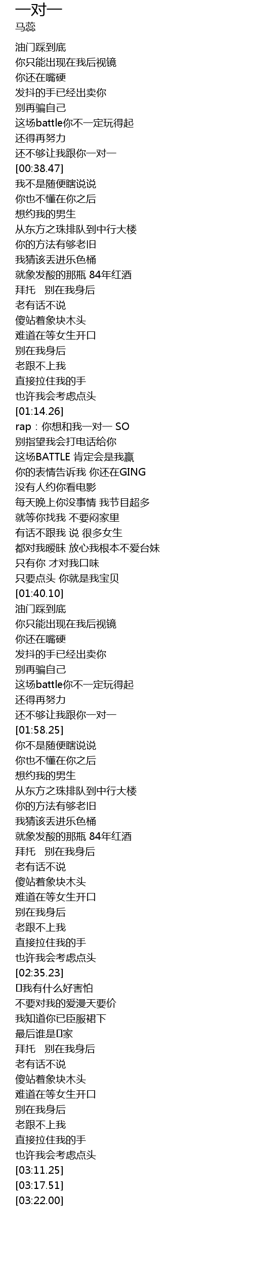 | [00:36.12] | hái bù gòu ràng wǒ gēn nǐ yī duì yī |