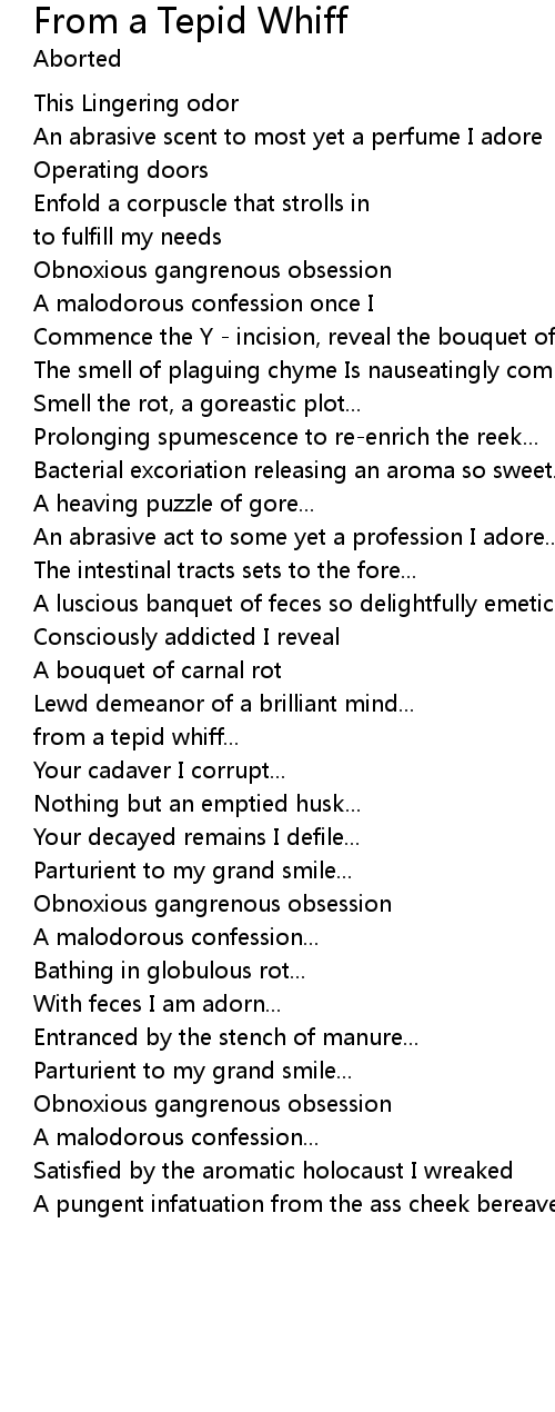 The smell of plaguing chyme Is nauseatingly compelling... |