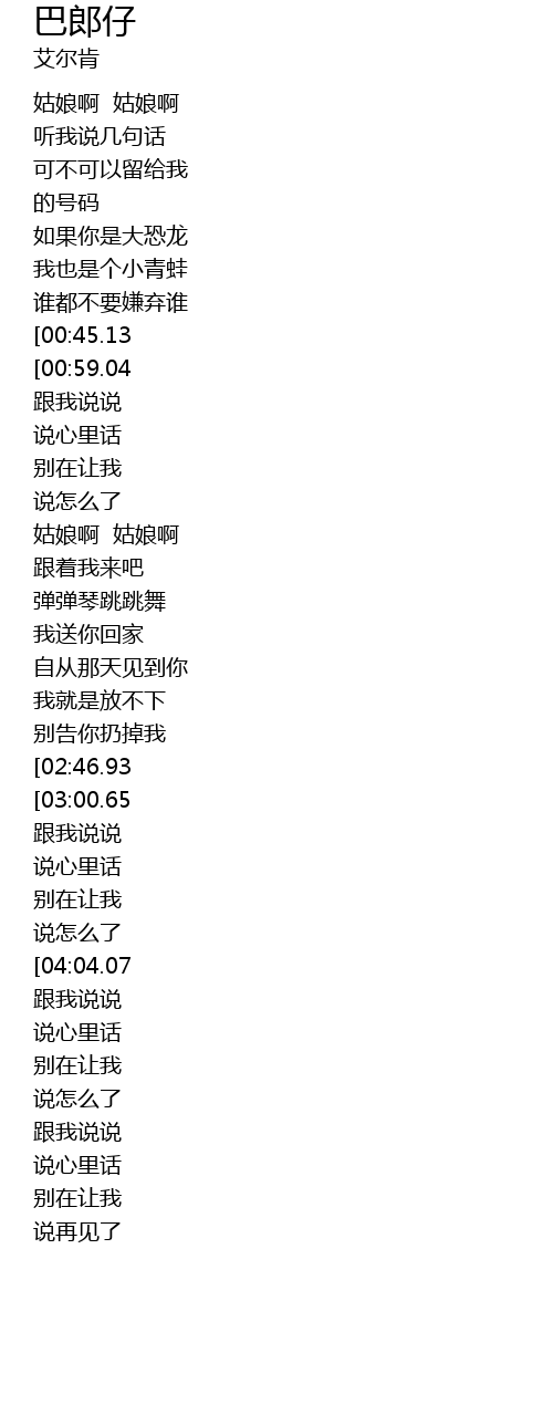 | [01:04.19][00:59.04][00:54.55][00:50.19] | qīn ài de lái ba lái ba lái ba lái ba lái ba lái ba |