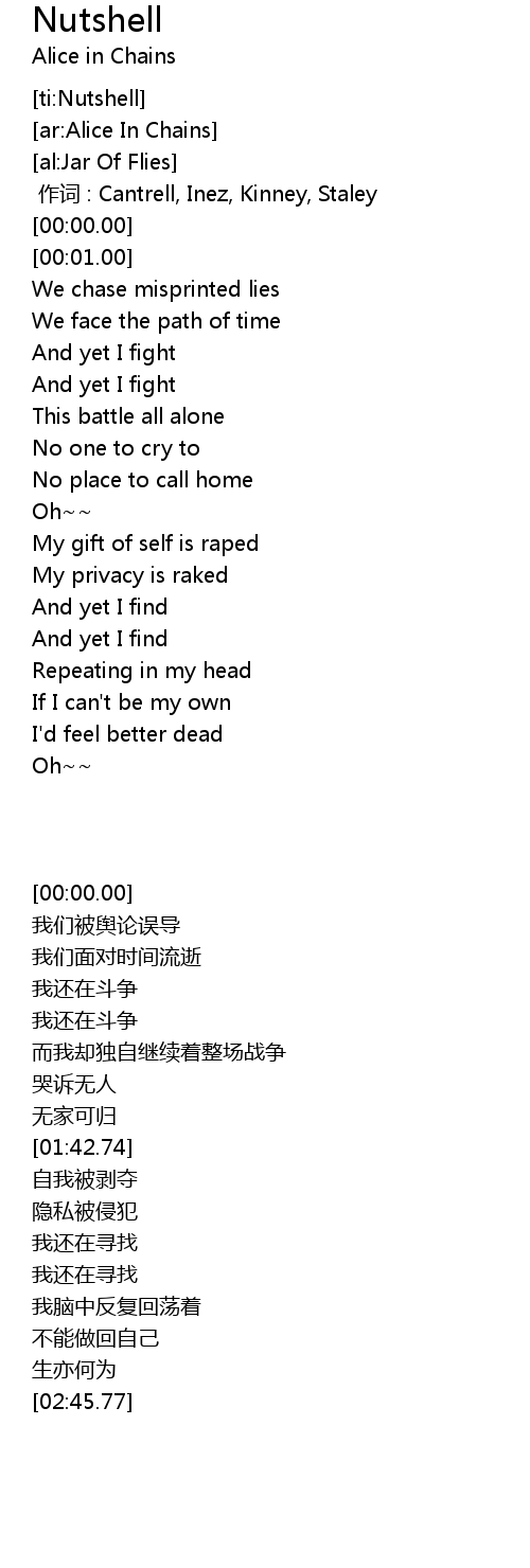 | [00:00.00] | 作词 : Cantrell, Inez, Kinney, Staley |