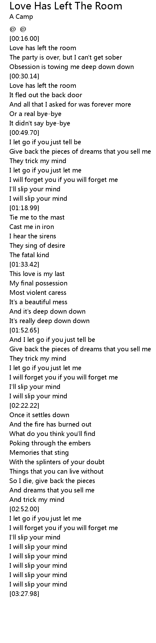 | [00:16.73] | Love has left the room |