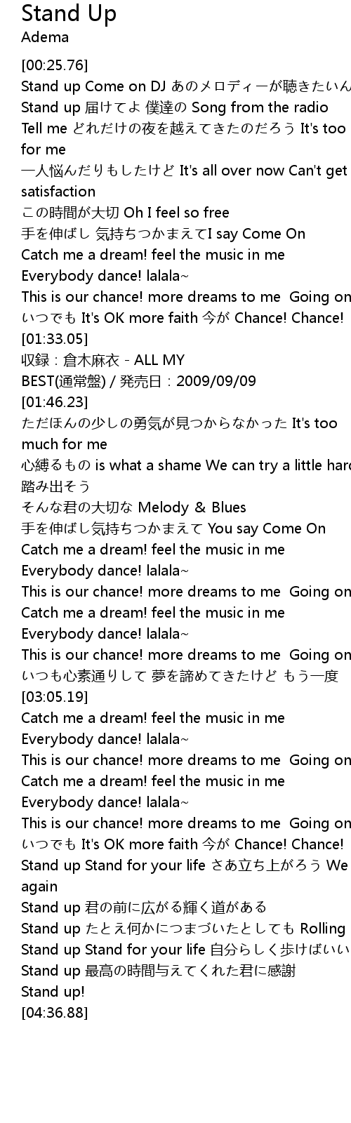 | [04:20.27] | Stand up Stand for your life 自分らしく歩けばいいよね |