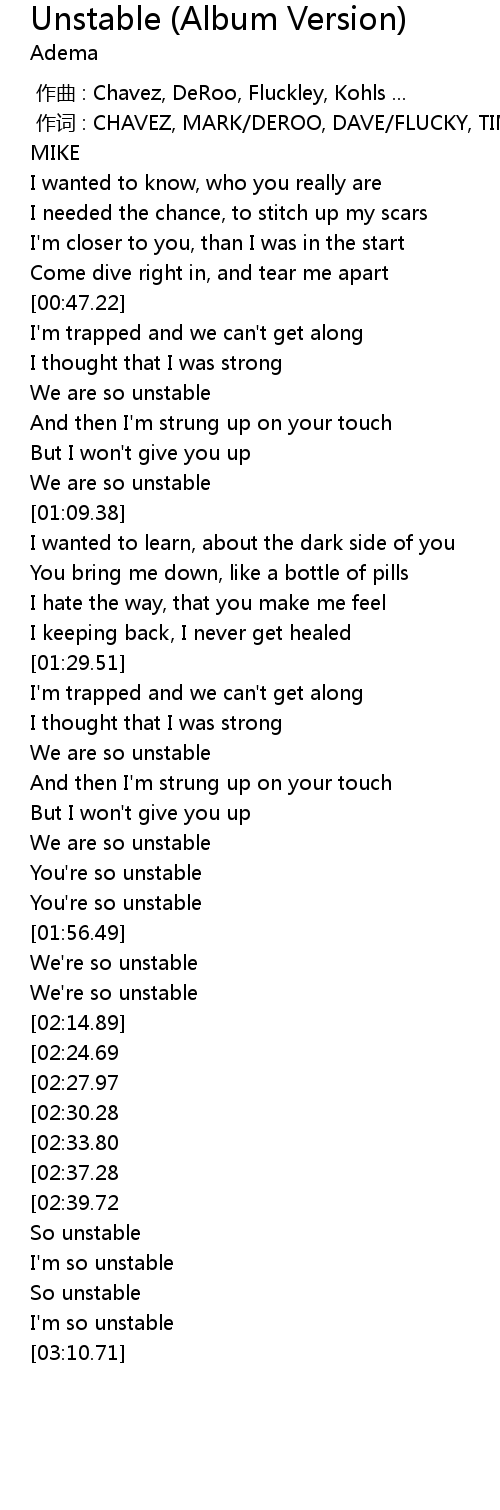 | [00:01.00] | 作词 : CHAVEZ, MARK/DEROO, DAVE/FLUCKY, TIM/KOHLSLAW, KRIS/RANSOM, MIKE |