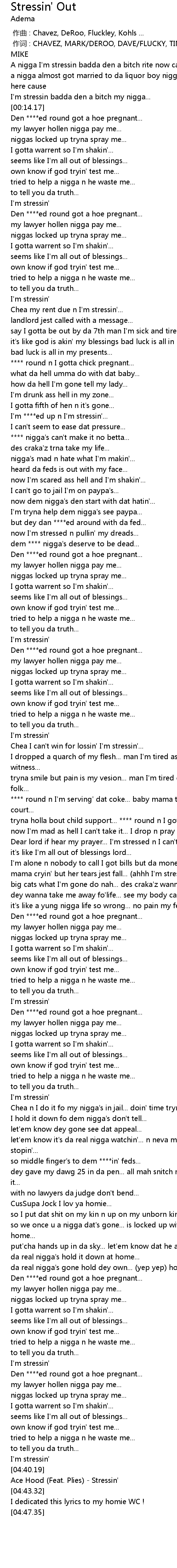| [04:41.22] | Ace Hood (Feat. Plies) - Stressin' |
