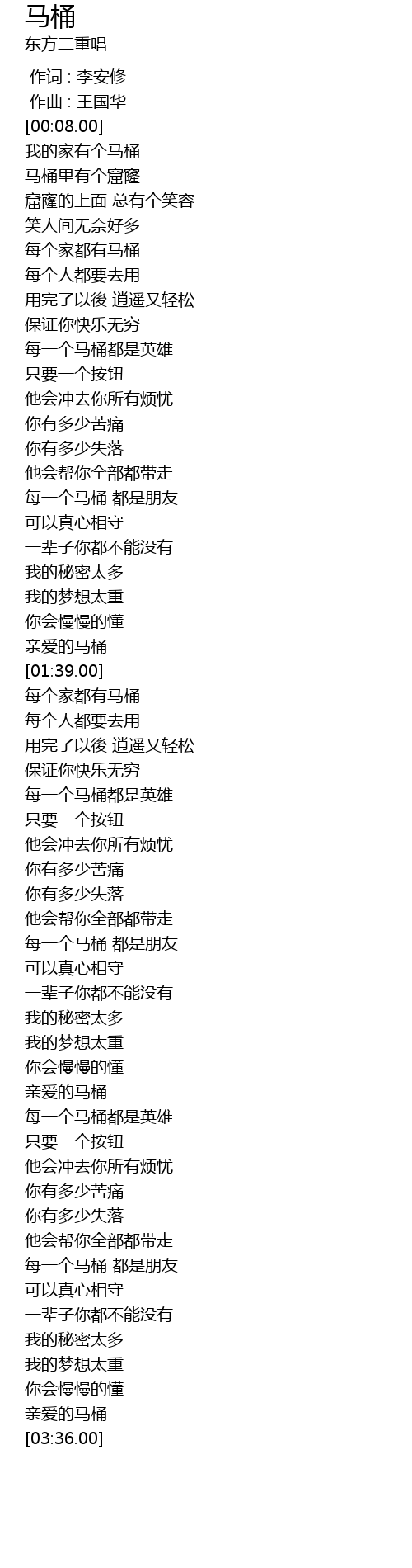 | [03:31.00] | 亲爱的马桶 |