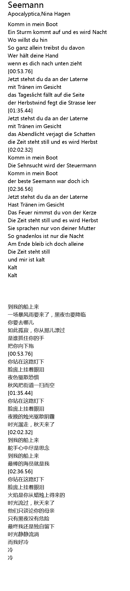| [01:36.28] | Jetzt stehst du da an der Laterne |