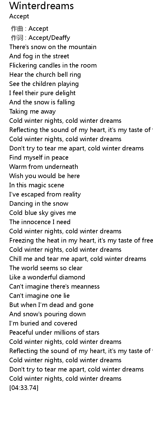 | [04:25.59] | Cold winter nights, cold winter dreams |