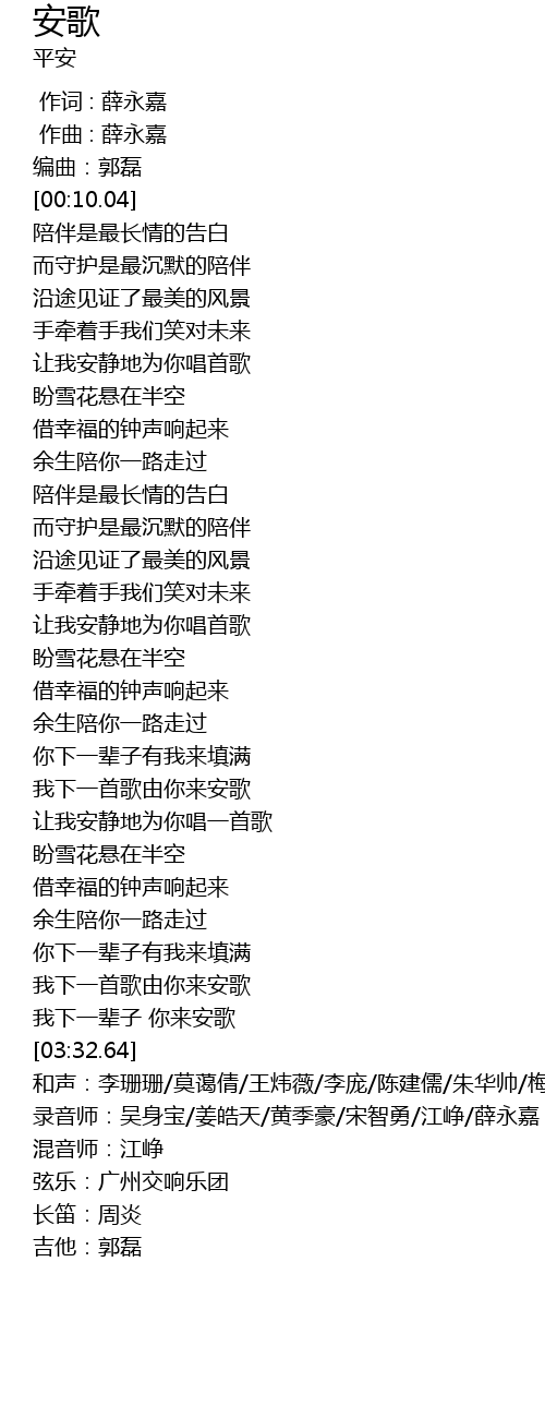 | [03:33.64] | 和声:李珊珊/莫蔼倩/王炜薇/李庞/陈建儒/朱华帅/梅舞嘉音合唱团 |
