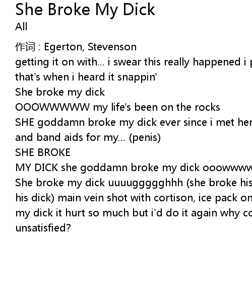 | She broke my dick uuuuggggghhh (she broke his dick) she broke my dick (i broke his dick) main vein shot with cortison, ice pack on the rest she goddamn broke my dick it hurt so much but i'd do it again why couldn't i have just left her unsatisfied? |
