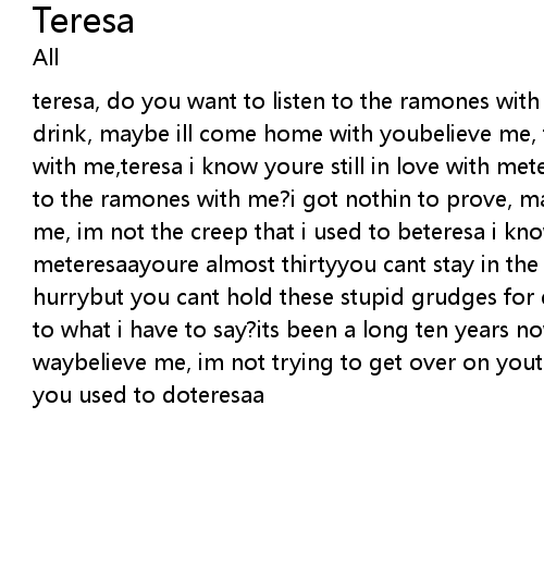 teresa, do you want to listen to the ramones with me?we'll get something to drink, maybe ill come home with youbelieve me, theres no telling whats wrong with me,teresa i know youre still in love with meteresa, do you want to listen to the ramones with me?i got nothin to prove, maybe i could be with youbelieve me, im not the creep that i used to beteresa i know youre still in love with meteresaayoure almost thirtyyou cant stay in the music business for everim in no hurrybut you cant hold these stupid grudges for everteresa do you want to listen to what i have to say?its been a long ten years now of us not getting our waybelieve me, im not trying to get over on youteresa i know you love me like you used to doteresaa |