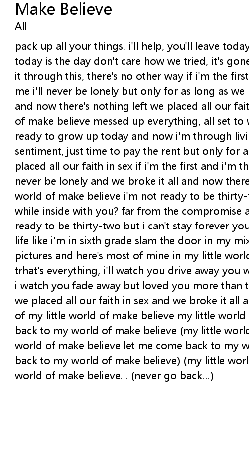pack up all your things, i'll help, you'll leave today we said we'd do it, and today is the day don't care how we tried, it's gone a thousand times we'll make it through this, there's no other way if i'm the first and i'm the only, promess me i'll never be lonely but only for as long as we believe and we broke it all and now there's nothing left we placed all our faith in sex of my little world of make believe messed up everything, all set to wash away but maybe i'm not ready to grow up today and now i'm through living as a criminal no time for sentiment, just time to pay the rent but only for as long as we believe we placed all our faith in sex if i'm the first and i'm the only, promess me i'll never be lonely and we broke it all and now there's nothing left of my little world of make believe i'm not ready to be thirty-two and can't i just stay a while inside with you? far from the compromise and shifty eyes and dirt i'm not ready to be thirty-two but i can't stay forever young with you i can't live my life like i'm in sixth grade slam the door in my mixed up ways here's all your pictures and here's most of mine in my little world of make believe guess trhat's everything, i'll watch you drive away you watched me grind away and now i watch you fade away but loved you more than this, i lived for your sweet kiss we placed all our faith in sex and we broke it all and now there's nothing left of my little world of make believe my little world of make believe let me come back to my world of make believe (my little world of make believe) my little world of make believe let me come back to my world of make believe (never go back to my world of make believe) (my little world of make believe) my little world of make believe... (never go back...) |