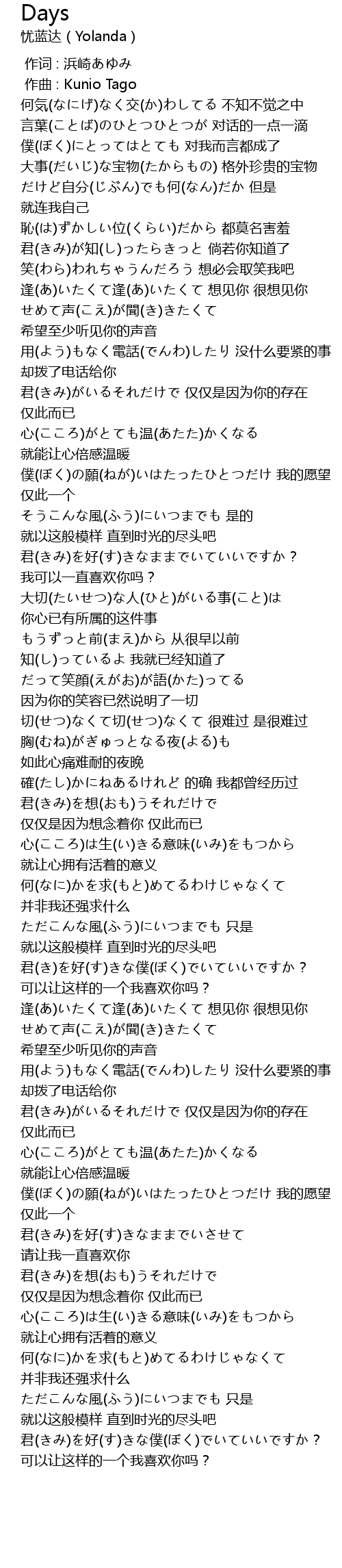 | [02:38.648] | 君(き)を好(す)きな僕(ぼく)でいていいですか? 可以让这样的一个我喜欢你吗? |