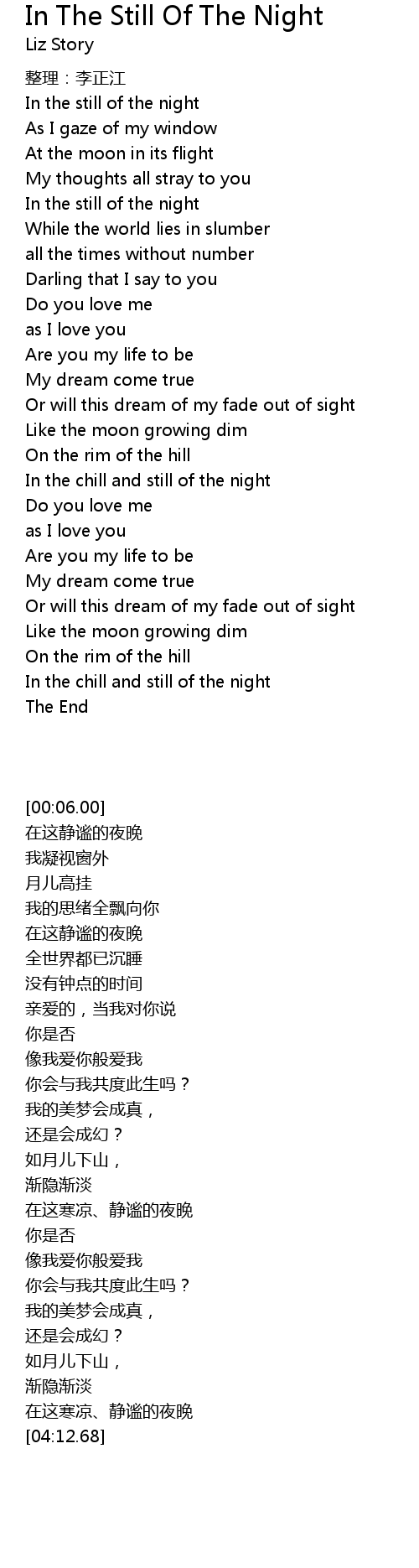| [00:31.00] | In the still of the night |