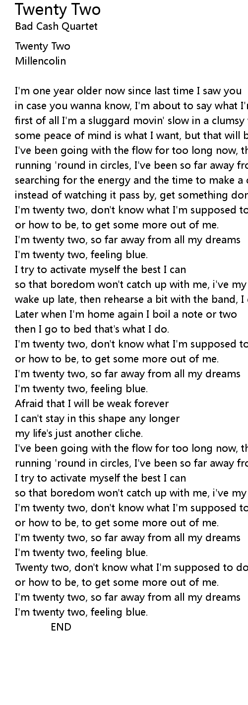 I'm twenty two, feeling blue. |