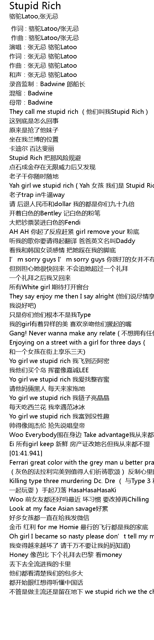 | [00:27.440] | Yah girl we stupid rich Yah nv hai wo men shi Stupid Rich |