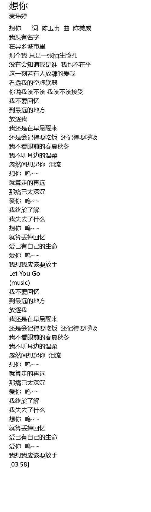 | [00:00] | 想你 词 陈玉贞 曲 陈美威 |