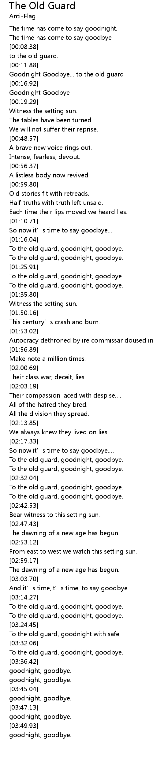 | [02:39.72] | To the old guard, goodnight, goodbye. |