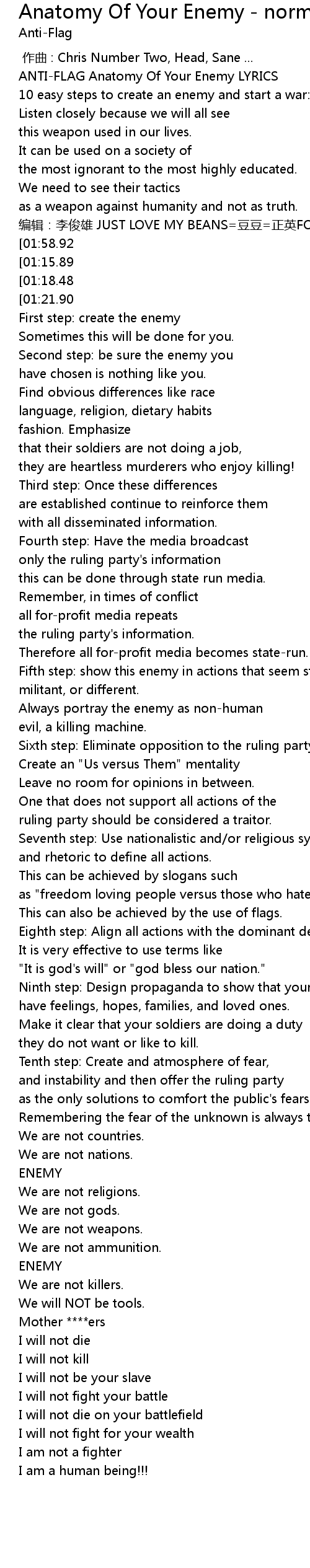 | [00:01.11] | ANTI-FLAG Anatomy Of Your Enemy LYRICS |