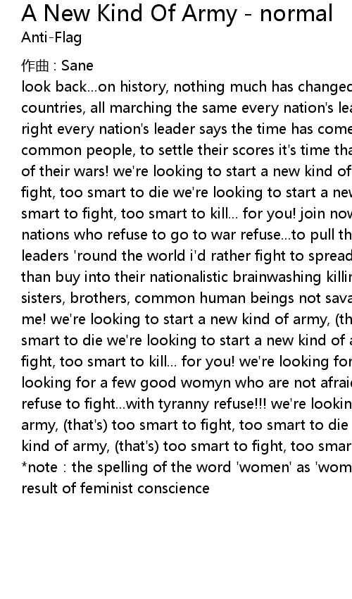 | look back... on history, nothing much has changed thousands... of soldiers of all countries, all marching the same every nation' s leader says that our side is right every nation' s leader says the time has come to fight but they use the common people, to settle their scores it' s time that we refuse to fight in any of their wars! we' re looking to start a new kind of army, that' s too smart to fight, too smart to die we' re looking to start a new kind of army, that' s too smart to fight, too smart to kill... for you! join now... the ranks of all nations who refuse to go to war refuse... to pull the trigger of a gun for leaders ' round the world i' d rather fight to spread some tolerance and unity than buy into their nationalistic brainwashing killing mothers, fathers, sisters, brothers, common human beings not savages but people, like you, like me! we' re looking to start a new kind of army, that' s too smart to fight, too smart to die we' re looking to start a new kind of army, that' s too smart to fight, too smart to kill... for you! we' re looking for a few good men we' re looking for a few good womyn who are not afraid to fight against tyranny but refuse to fight... with tyranny refuse!!! we' re looking to start a new kind of army, that' s too smart to fight, too smart to die we' re looking to start a new kind of army, that' s too smart to fight, too smart to kill... for you! note: the spelling of the word ' women' as ' womyn' is not a misspelling, but a result of feminist conscience |