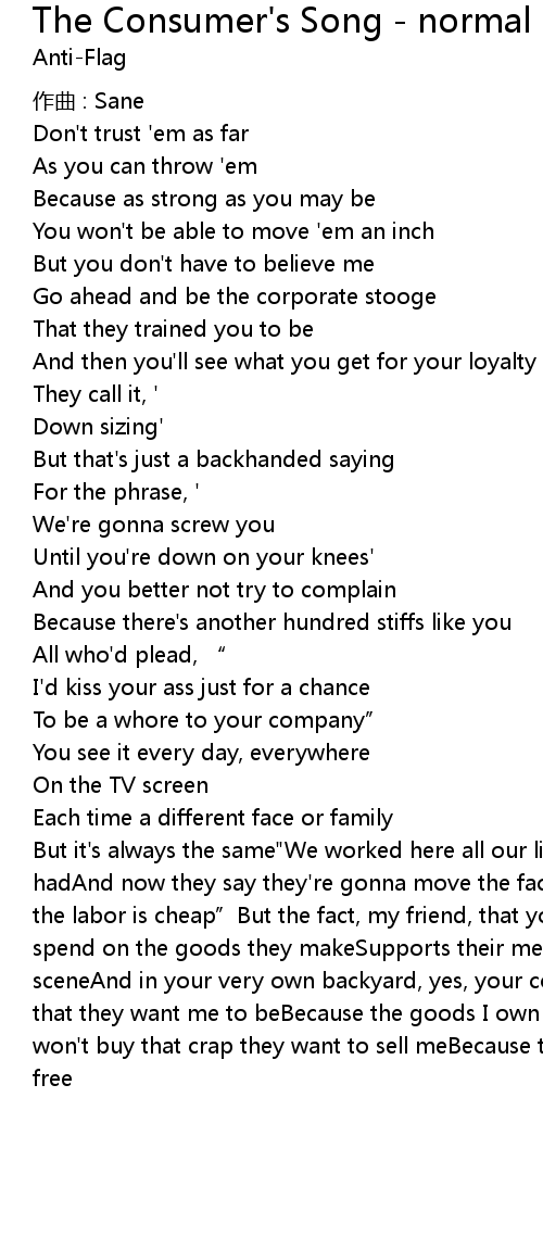 | But it' s always the same" We worked here all our livesGave them everything we hadAnd now they say they' re gonna move the factoryTo a Third World country where the labor is cheap" But the fact, my friend, that you don' t seeIs the money you spend on the goods they makeSupports their methods of abuse on the Third World sceneAnd in your very own backyard, yes, your countrySo I won' t be the consumer that they want me to beBecause the goods I own aren' t going to set me freeSo I won' t buy that crap they want to sell meBecause the goods I own won' t set anyone free |