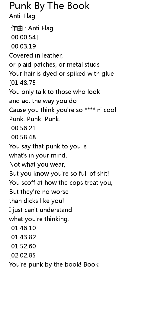 | [01:00.39][00:56.21][00:52.23] | Punk by the book. |