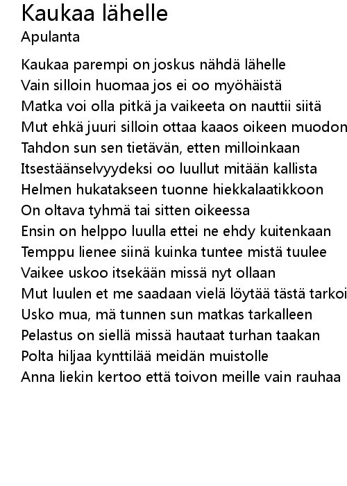 | Vaikee uskoo itsek n miss nyt ollaan | |