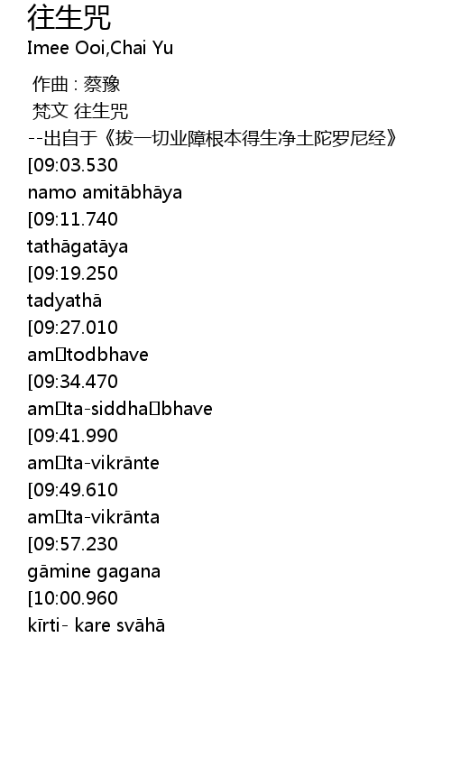 | [00:01.620] | 梵文 往生咒 --出自于《拔一切业障根本得生净土陀罗尼经》 |