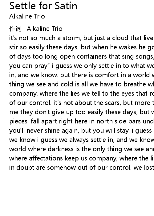 | it' s not so much a storm, but just a cloud that lives inside of me he doesn' t stir so easily these days, but when he wakes he goes the distance in a marathon of days too long open containers that sing songs, " you' ll never dream again, but you can pray" i guess we only settle in to what we know i guess we always settle in, and we know. but there is comfort in a world where darkness is the only thing we see and cold is all we have to breathe where affectations keep us company, where the lies we tell to the eyes that roll in doubt are somehow out of our control. it' s not about the scars, but more the crowds that walk all over me they don' t give up too easily these days, but when they break they go to pieces. fall apart right here in north side bars under a sky that knows no stars you' ll never shine again, but you will stay. i guess we only settle in to what we know i guess we always settle in, and we know. but there is comfort in a world where darkness is the only thing we see and cold is all we have to breathe where affectations keep us company, where the lies we tell to the eyes that roll in doubt are somehow out of our control. we lost control. |