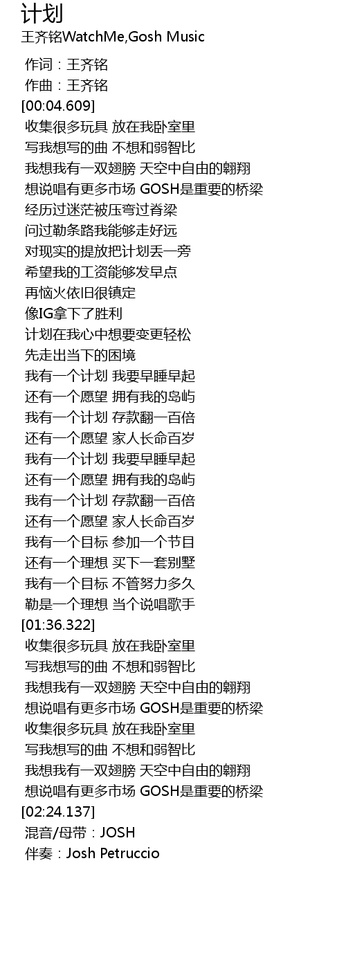 | [00:48.308] | wǒ yǒu yí gè jì huà wǒ yào zǎo shuì zǎo qǐ |