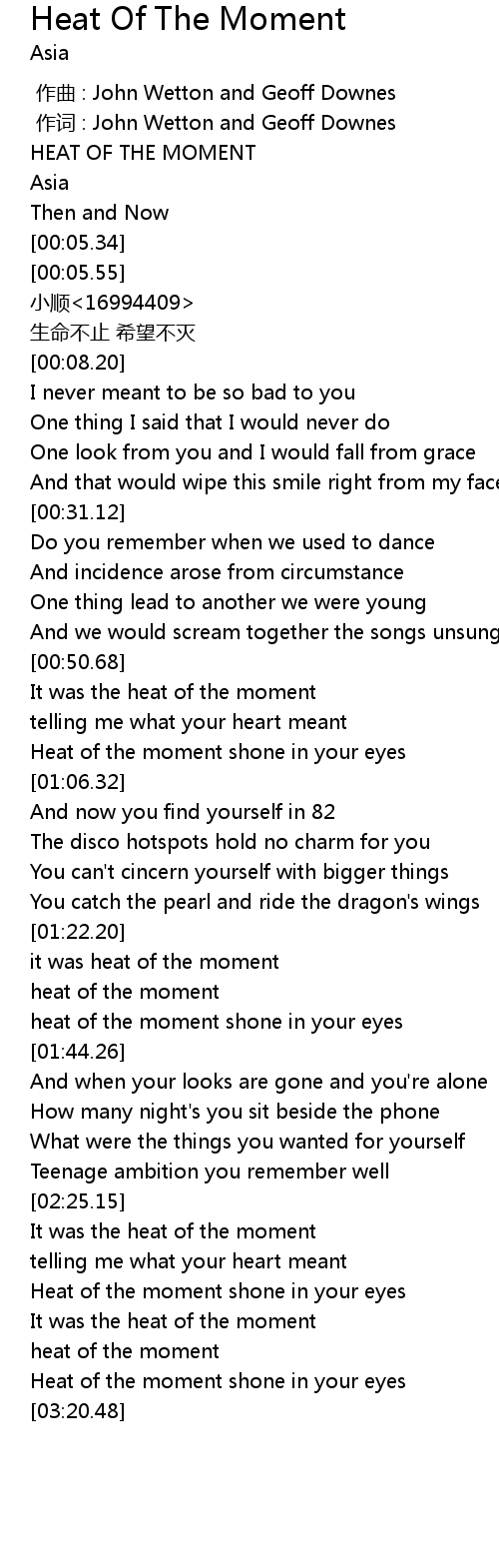| [00:59.16] | Heat of the moment shone in your eyes |