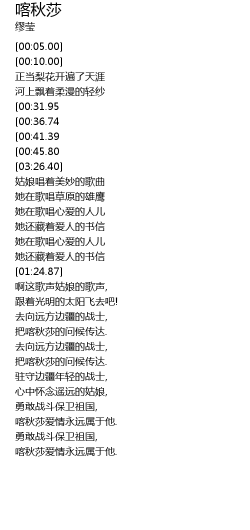 | [02:58.15][00:31.95] | 喀秋莎站在竣峭的岸上 |