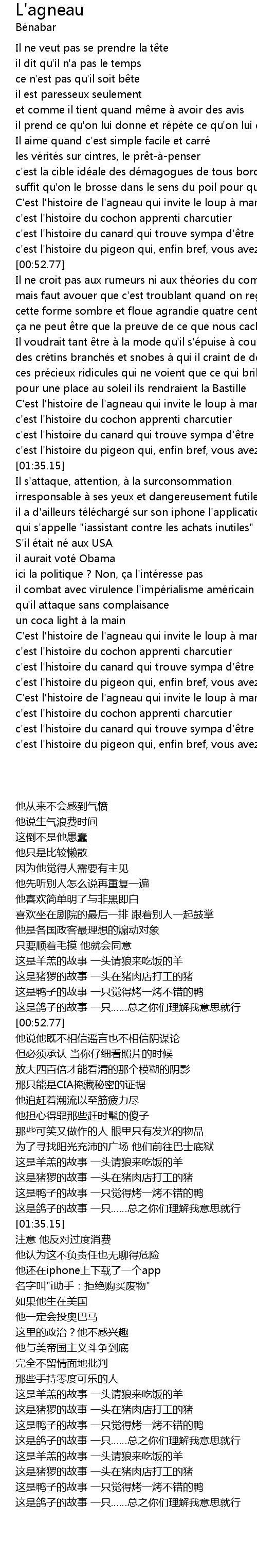 | [01:21.35] | C' est l' histoire de l' agneau qui invite le loup a manger |