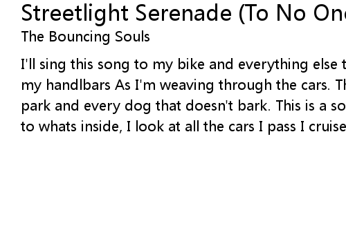 | I'll sing this song to my bike and everything else that I like this goes out to my handlbars As I'm weaving through the cars. This is for my squirrels in the park and every dog that doesn't bark. This is a song about a ride and listening to whats inside, I look at all the cars I pass I cruise myself in the glass |