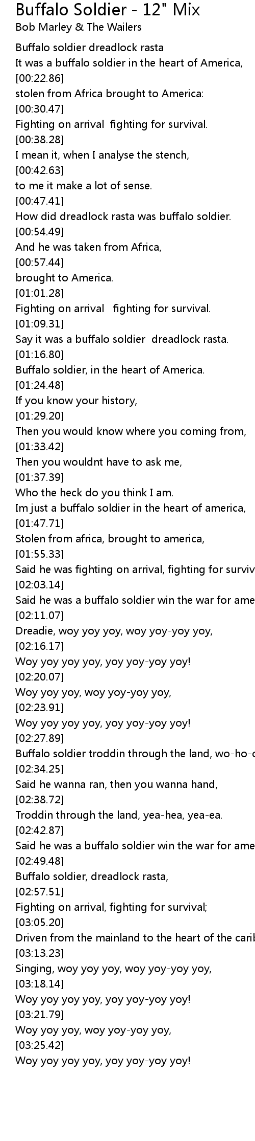 Buffalo soldier troddin through the land, wo-ho-ooh! |