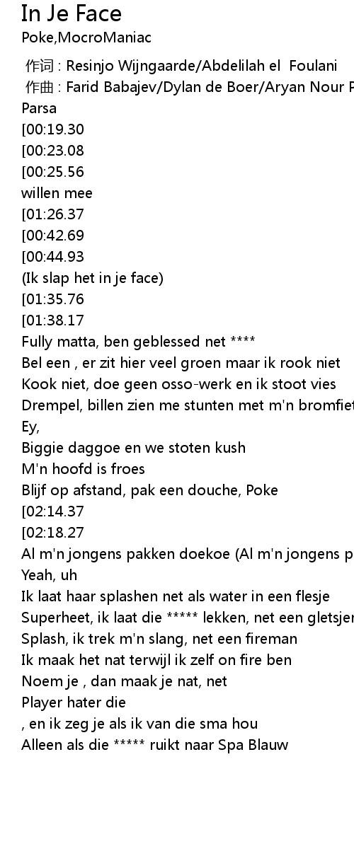 | [00:40.64][01:38.17][02:35.79] | In je face Ik slap het in je face |