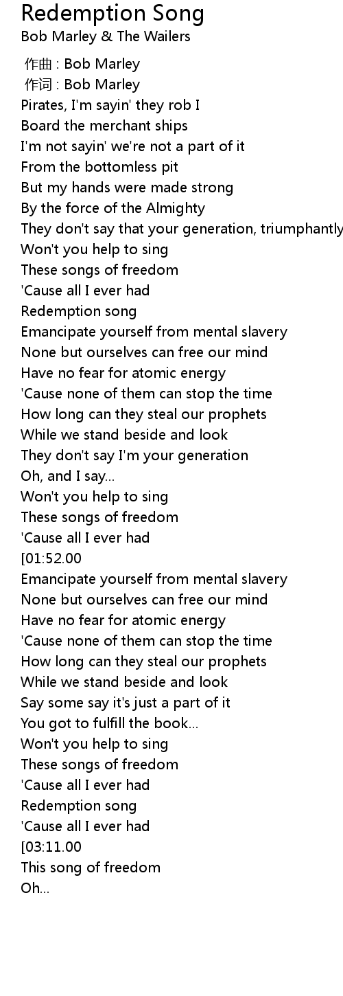 | [03:15.00][03:11.00] | Redemption song (2x) |
