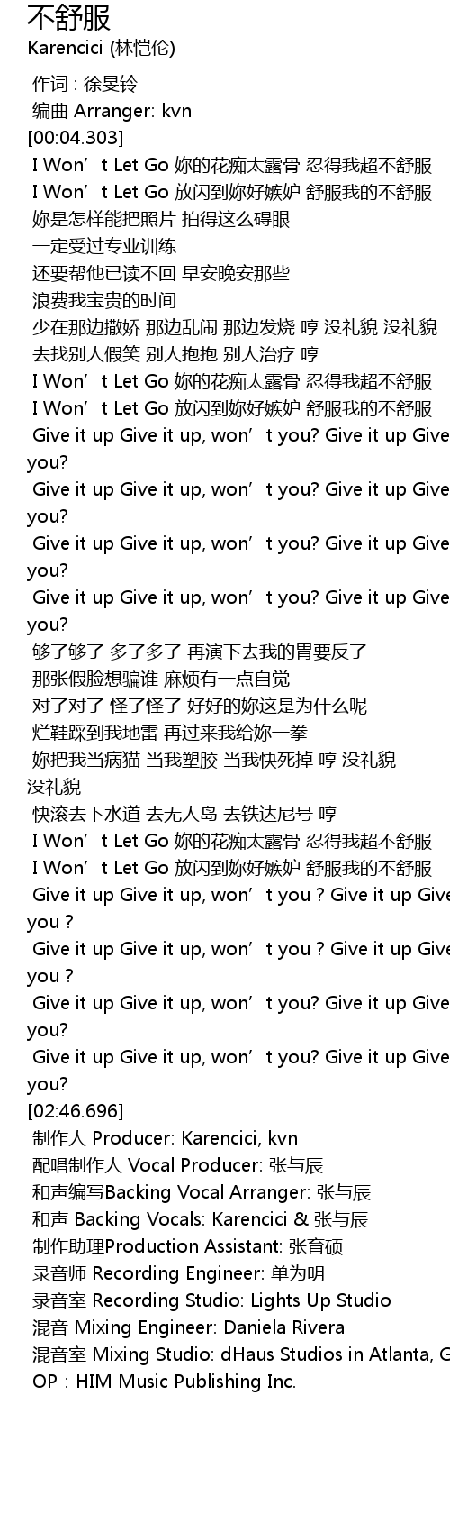 | [02:49.228] | 和声 Backing Vocals: Karencici & 张与辰 |