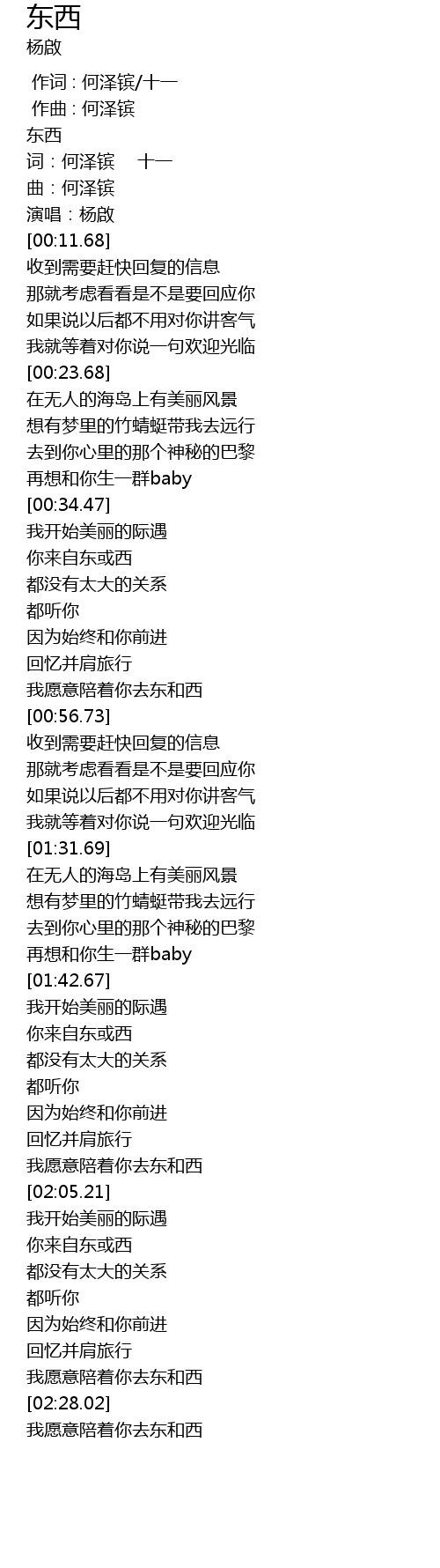| [02:29.30] | 我愿意陪着你去东和西 |
