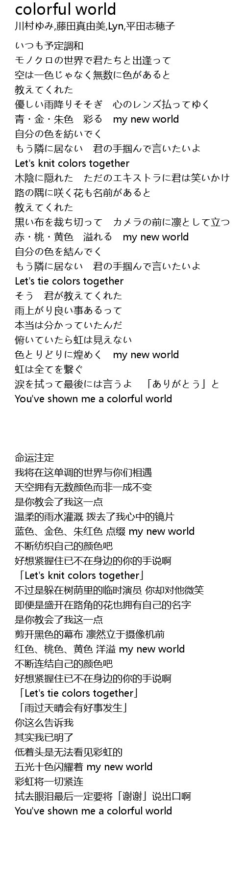 | [02:45.213] | 赤・桃・黄色 溢れる my new world |